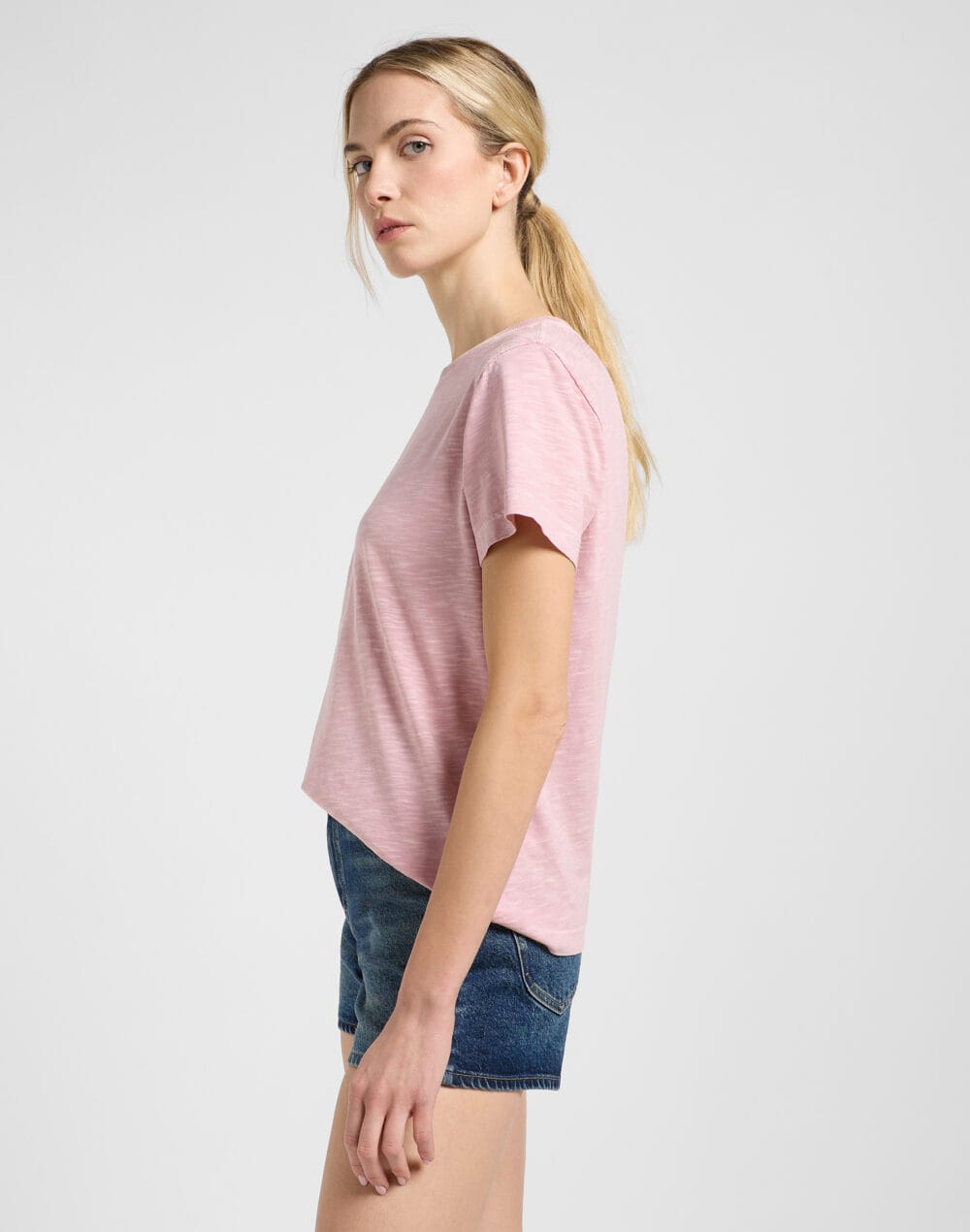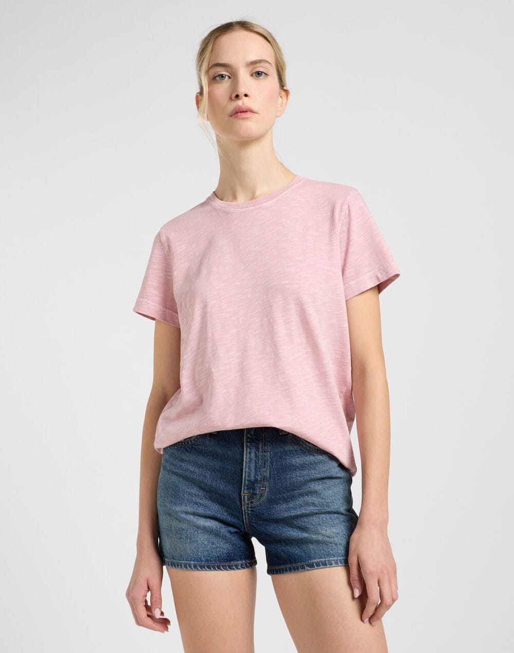 צבע הבד -Off-pink / Soft Mauve – גוון ורוד-פסטל שעבר שטיפה עדינה כדי לתת לחולצה מראה רך ומעט משומש.